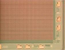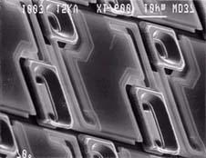 It consists of a two-layer structure. An interconnecting readout circuitry is applied to the silicon process wafer and then the microbolometer structure is built on top of the readout circuitry. First a pattern of islands _ wavelength thick are deposited on the readout circuitry. The islands are made of a material that can be selectively etched away later to form a bridge structure. Three layers -- silicon nitride, vanadium oxide, and silicon nitride -- are deposited over the sacrificial islands. The sacrificial islands are then etched away leaving the thermally isolated bridge structure of vanadium oxide. A photo of an early Honeywell microbolometer element is shown in the picture below followed by a photo of one corner of a 320 by 240 microbolometer array
