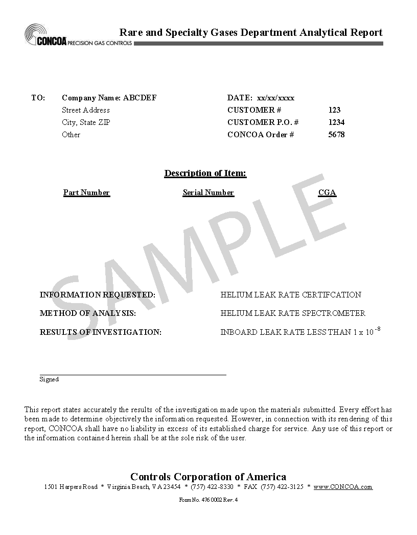 美國CONCOA公司氦氣泄露證書(例子)